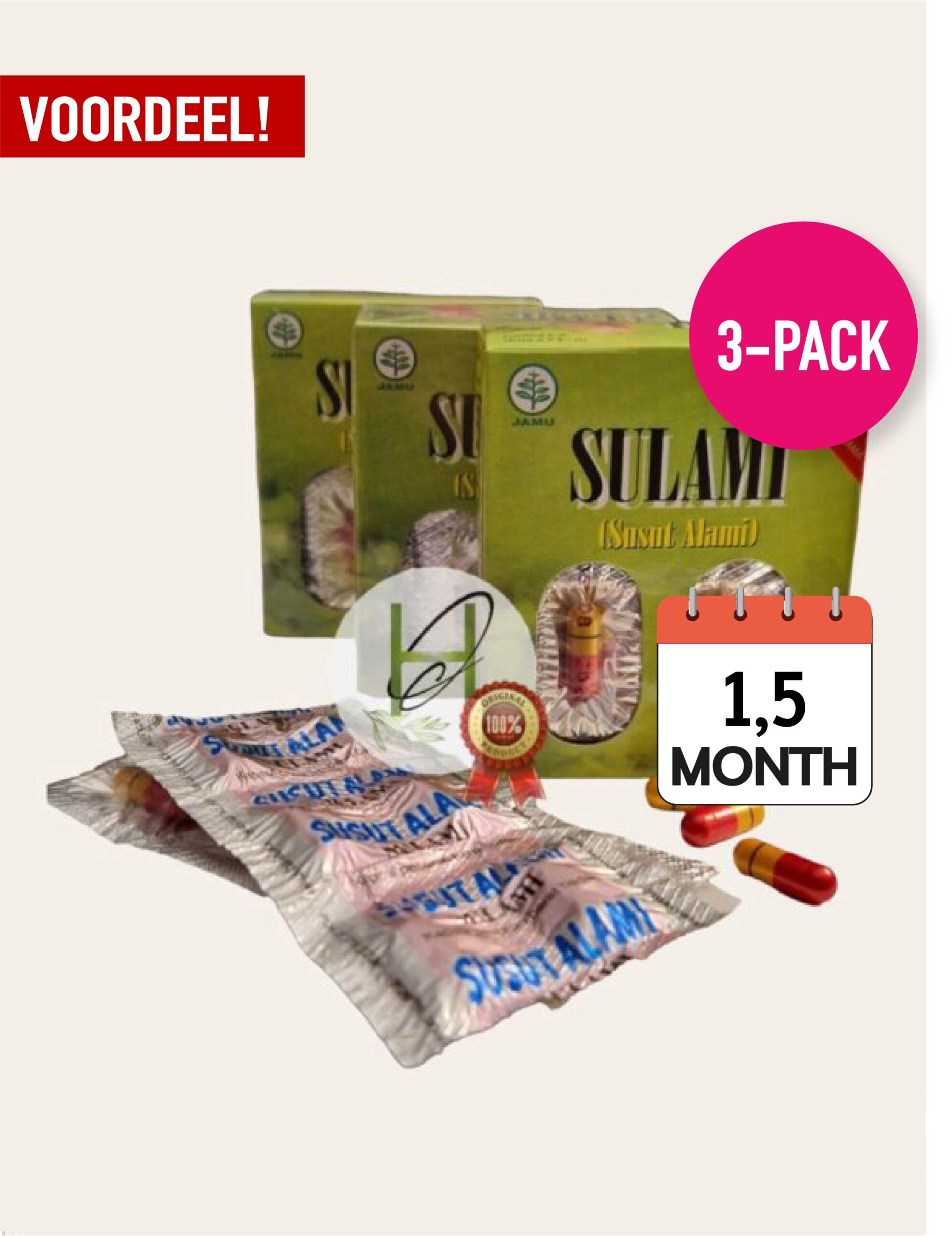 | Inhoud 3-pack: | 3 doosjes à 5 gesealde strips met 6 capsules. Totaal 90 capsules (1,5 maand) |